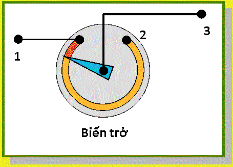 Phần màu vàng là một lớp điện trở. Cây kim màu xanh được đè chặt xuống phần điện trở này. Giả sử có dòng điện đi từ 1 đến 3 thì nó sẽ phải qua phần màu vàng (được tô đỏ) và đó chính là điện trở hiện tại của biến trở. Bạn chỉ việc vặn cây kim để tăng giảm độ dài của vùng màu đỏ, qua đó tăng giảm giá trị điện trở.
