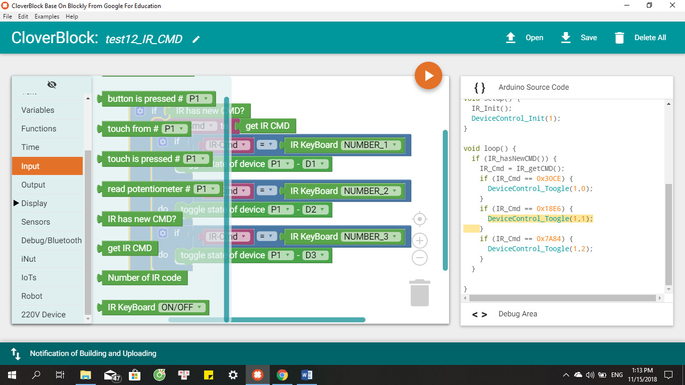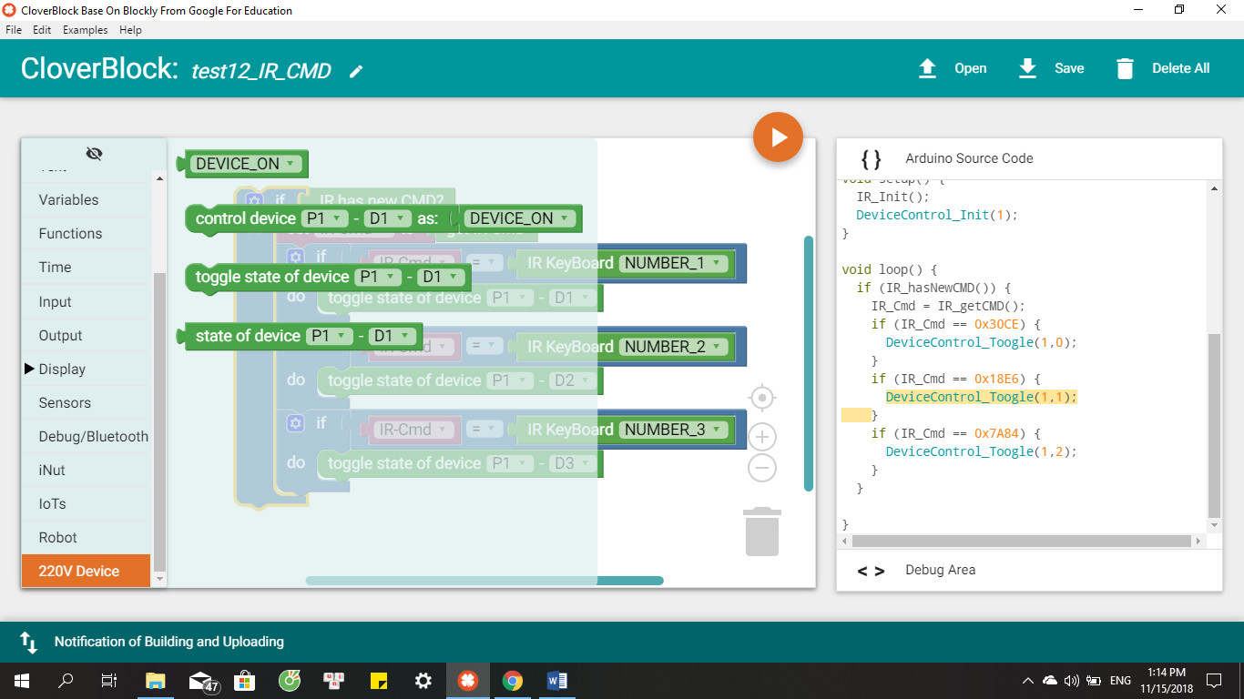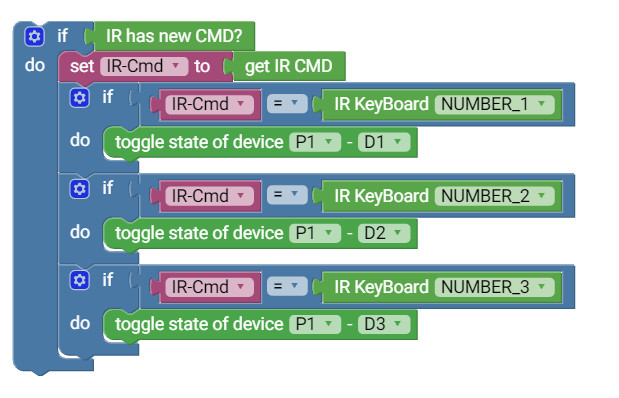 Tập các block để đọc dữ liệu từ điều khiển hồng ngoại và các tập lệnh để điều khiển ổ cắm tích hợp đều có sẵn:
