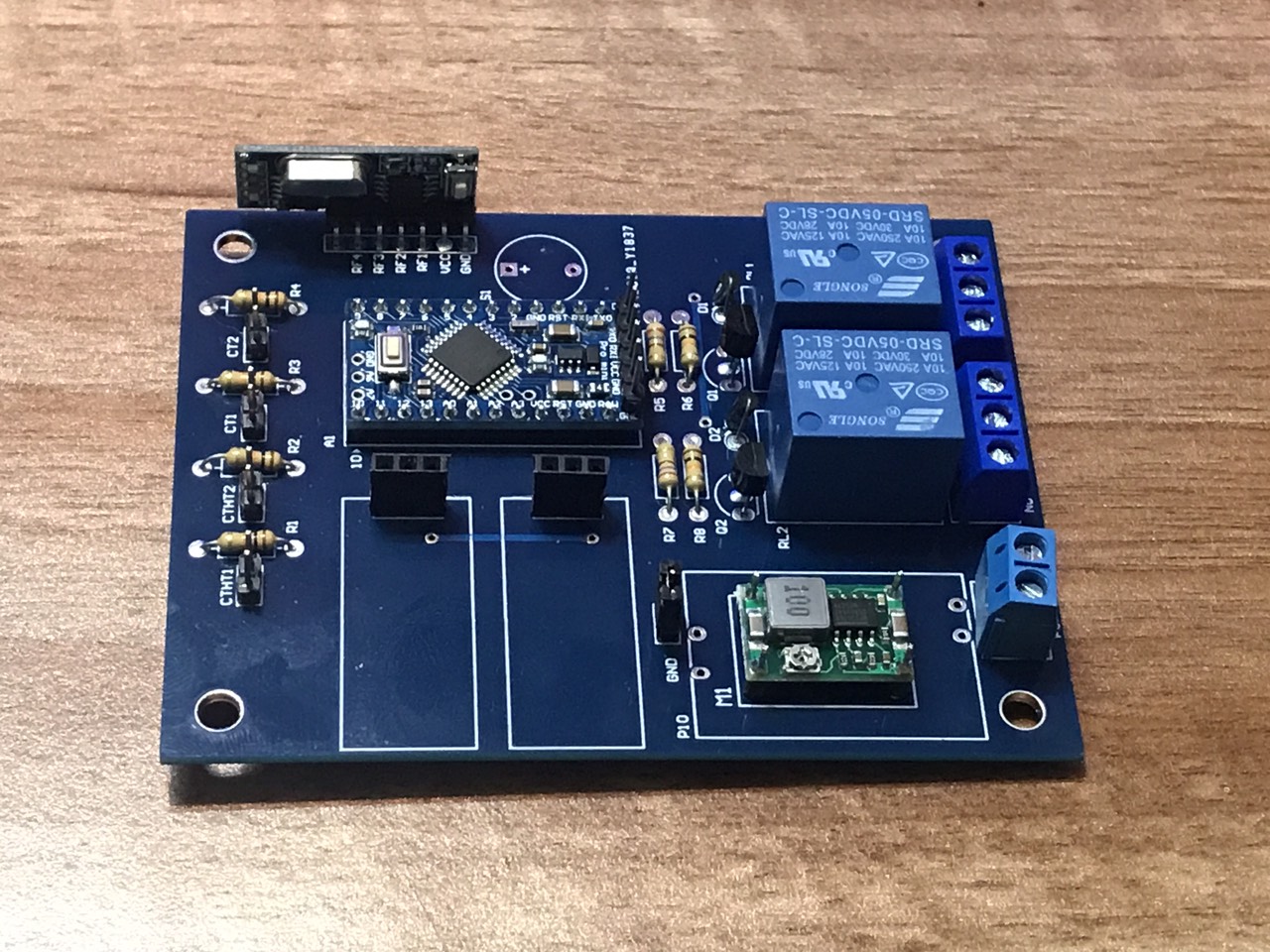 2. Phiên bản 2: Đây là thiết bị sử dụng dùng module vi xử lý. Thiết bị có cảm biến mưa, cảm biến ánh sáng, khiển RF, relay 10A, nguồn 12V - 24V. Mạch dùng cho loại động cơ giảm tốc DC 1 chiều loại nhỏ, động cơ cửa cuốn.
