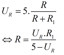 Ta có điện áp tại A thông qua analogRead và ta cần tìm giá trị của R nên áp dụng công thức tính U của mạch cầu phân áp ta có: