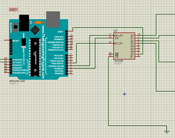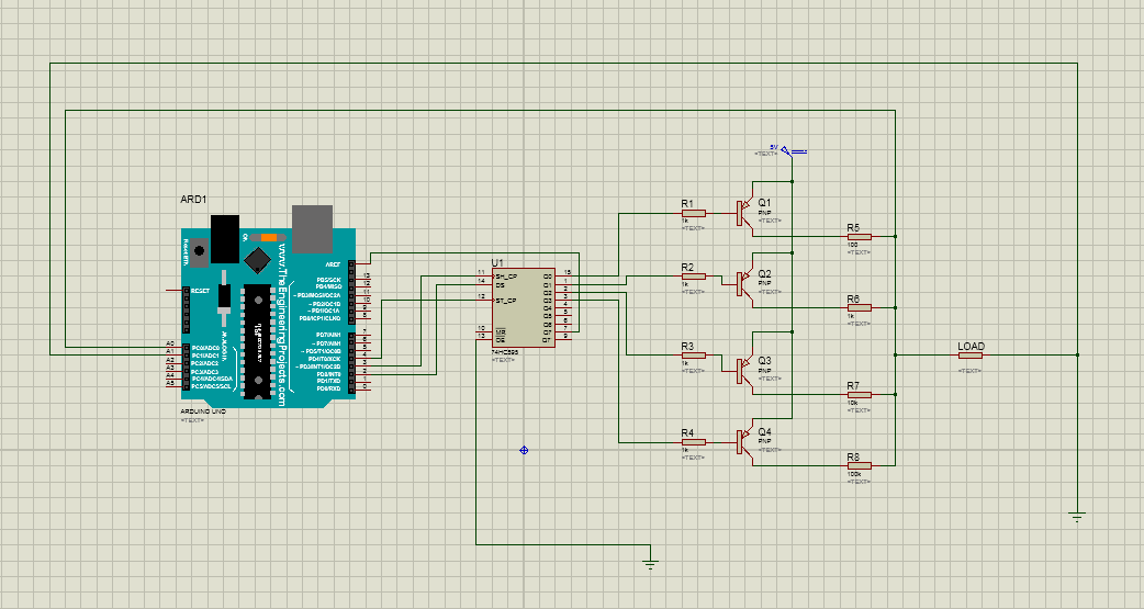 Cụ thể ở đây chân Q0 sẽ mắc vào R1, Q1 vào R2, Q2 vào R3, Q3 vào R4 và Q7 vào chân analogReference (AREF) trên Arduino. SH_CP (clock) vào chân 3, ST_CP (latch) vào chân 4 và DS (data) vào chân 2. Phần nối chung của 4 con điện trở R5 đến R8 thì mắc vào A0, phần GND sau tải thì mắc vào A1. Sau đó các bạn nạp đoạn code sau: