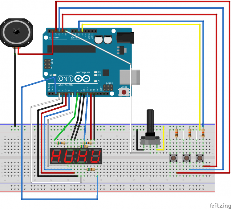Chúng ta sẽ mắc 3 điện trở button kiểu PULL DOWN và pinMode cho chúng là INPUT. Thứ tự của 3 button từ trái qua phải lần lượt là 1, 2, 3 và 3 button này được mắc lần lượt với chân Analog A3, Analog A2, Analog A1. Tiếp theo chúng ta sẽ gắn loa theo sơ đồ sau, nếu các bạn không phân biệt được cực âm cực dưong của loa thì cũng không sao cả, chúng ta chỉ việc chọn đại một chân nào đó để làm cực âm thôi (chân còn lại nối vào Analog A4).