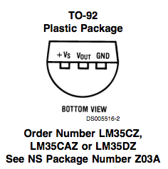 Như vậy, bằng cách đưa vào chân bên trái của cảm biến LM35 hiệu điện thế 5V, chân phải nối đất, đo hiệu điện thế ở chân giữa bằng các pin A0 trên arduino (giống y hệt cách đọc giá trị biến trở), bạn sẽ có được nhiệt độ (0-100ºC) bằng công thức: