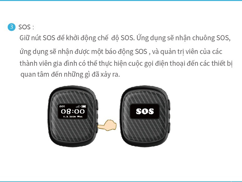 Không phải lúc nào bạn cũng ngồi theo dõi xem người thân của bạn đang đi đâu. Hoặc nếu có theo dõi bạn không thể biết được họ có gặp nguy hiểm không. Chính vì vậy các nhà sản xuất đã tích hợp một nút SOS ngay trên sản phẩm. Trong trường hợp khẩn cấp mà người thân của bạn có mang theo thiết bị định vị cầm tay siêu nhỏ Torosi Candy 2C. Họ chỉ cần bấm vào nút SOS liên tục trong 3 giây. Thì ngay lập tức thông tin nguy hiểm sẽ được gửi đến chiếc điện thoại của bạn. Cùng với đó là bạn sẽ nhận được tin nhắn về vị trí chính xác người thân đang ở đâu. Từ đó sẽ có biện pháp để giải quyết.