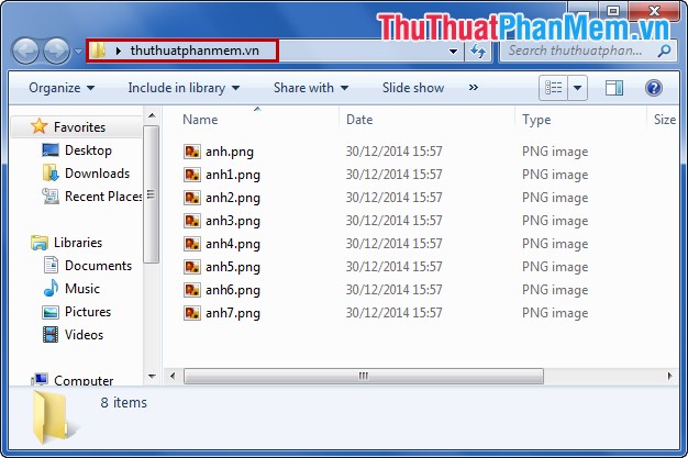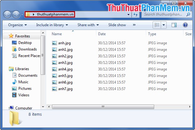 Ví dụ: Trong thư mục thuthuatphanmem.vn tất cả các file đều có đuôi là .jpg như sau.