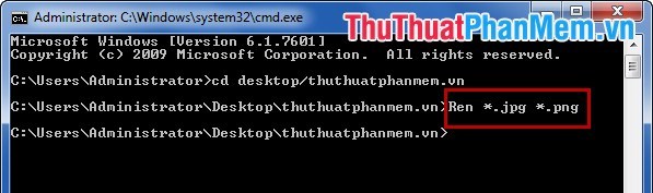 Nếu muốn đuổi đuôi file từ jpg sang đuôi file png các bạn nhập lệnh Ren *.jpg *.png sau đó nhấn Enter.
