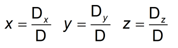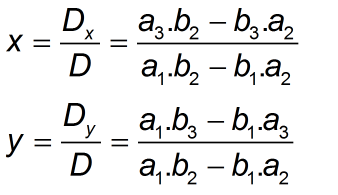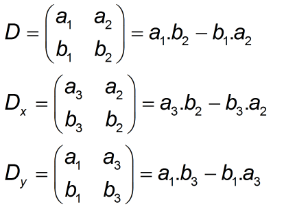 Từ đó ta có công thức nghiệm tổng quát của hệ là (nếu det D=det Dx= det Dy=0 thì hệ có vô số nghiệm còn nếu det D=0 và det Dx, det Dy khác 0 thì hệ vô nghiệm):