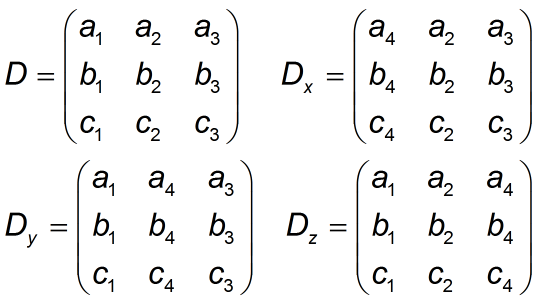 Ta cần tính 4 định thức ma trận vuông 3x3 như sau: