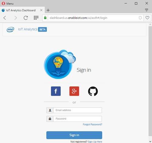 Trong phần đầu tiên, người dùng cần tạo cho mình một tài khoản tại trang web IoT Analyticsđược cung cấp bởi hãng Intel. Trang web đang được ở giai đoạn Beta, tuy nhiên vẫn cung cấp cho bạn nhiều tính năng hữu ích trong việc nhận và phân tích dữ liệu gởi đến từ các thiết bị IoT.