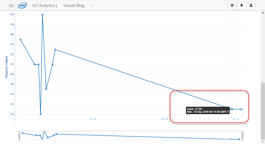 Sau khi đăng ký cảm biến được sử dụng tại Edison, bạn có thể thực hiện gởi dữ liệu thử nghiệm để phục vụ phân tích, thống kê thông qua lệnh iotkit-admin observation temp 35; lệnh này cho phép ghi nhận dữ liệu vào cảm biến nhiệt độ là 35 độ C. Bạn có thể lần lượt thay đổi giá trị nhiệt độ để xem kết quả thống kê tại giao diện web.