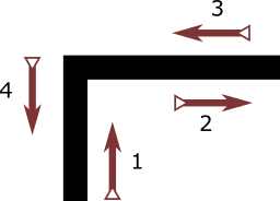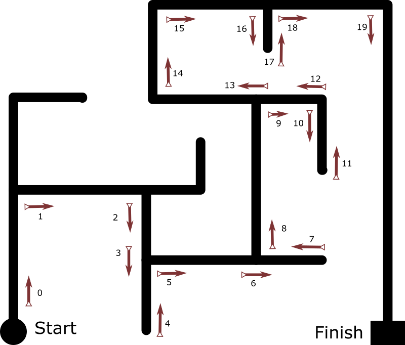 Giả sử xe dò đường của chúng ta sử dụng thuật toán bám tường phải. Sau một hồi mò mẫm ta có đường đi như hình, tại mỗi điểm rẽ ta đều ghi lại hướng tiếp theo sẽ di chuyển. Chuỗi đường đi sẽ như sau: URDD URRL URDU LLUR DURD (mình viết cách ra cho dễ nhìn thôi nhé, thực tế chuỗi được ghi liền)