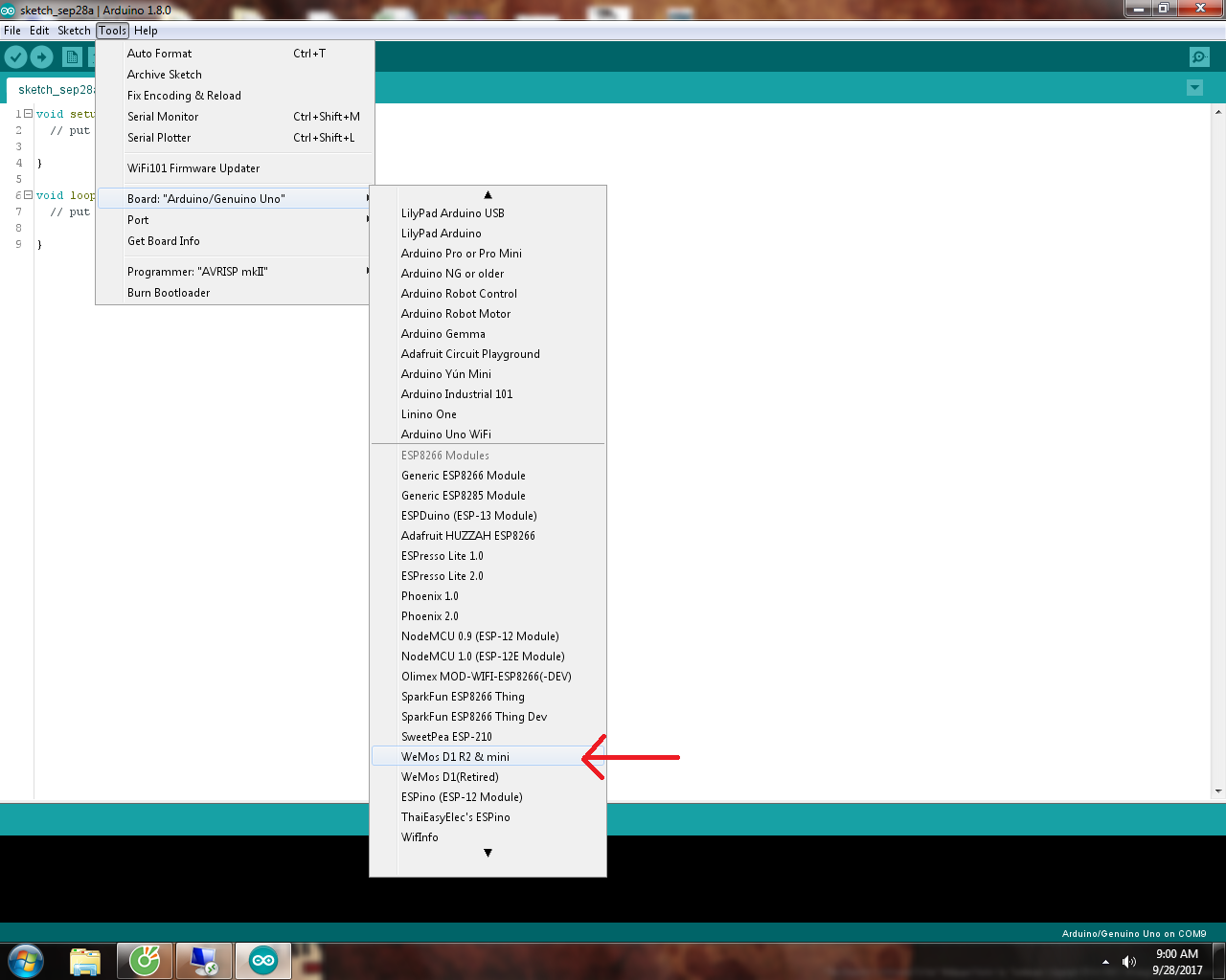 Sau khi các bạn cài đặt board xong, các bạn vào mục Tools => Board => Kéo xuống chọn board "Wemos D1 R2 & Mini"