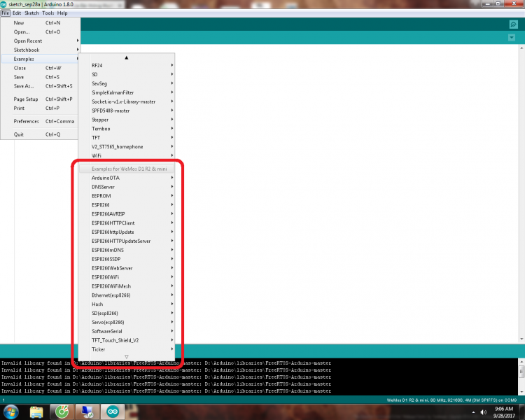 Sau khi chọn board Wemos D1 R2, trong mục Examples sẽ tự động xuất hiện mục code mẫu cho board này, bạn tha hồ mà test
