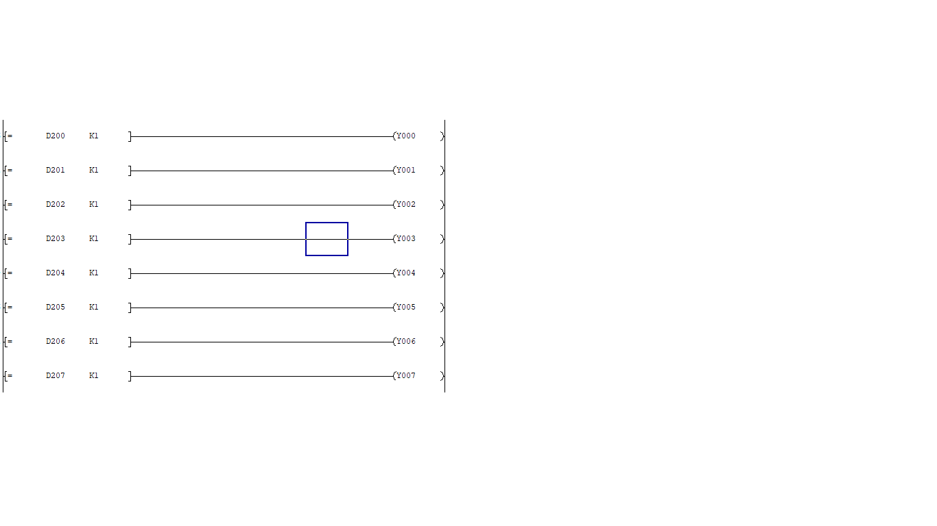 - Ý tưởng của chương trình sẽ dùng các thanh ghi từ D200 - D207 để điều khiển 8 cổng OUT từ Y000-Y007. Sau đó lưu trạng thái của các cổng ra vào từng bit của thanh ghi D101. Kiểm soát chế độ ON - OFF của 8 cổng IN từ X000 - X007. Lưu trạng thái của 8 cổng IN vào từng bit của thanh ghi D102.