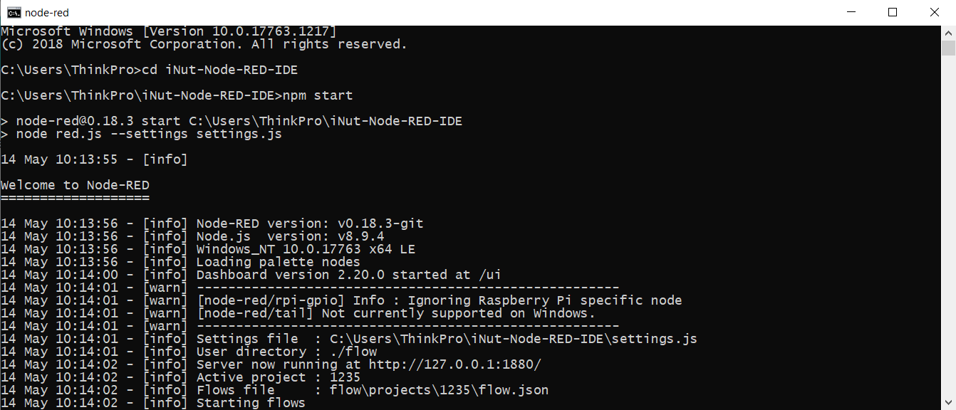 - cd iNut-Node-RED-IDE (sau đó Enter và nhập tiếp lệnh bên dưới vào)
