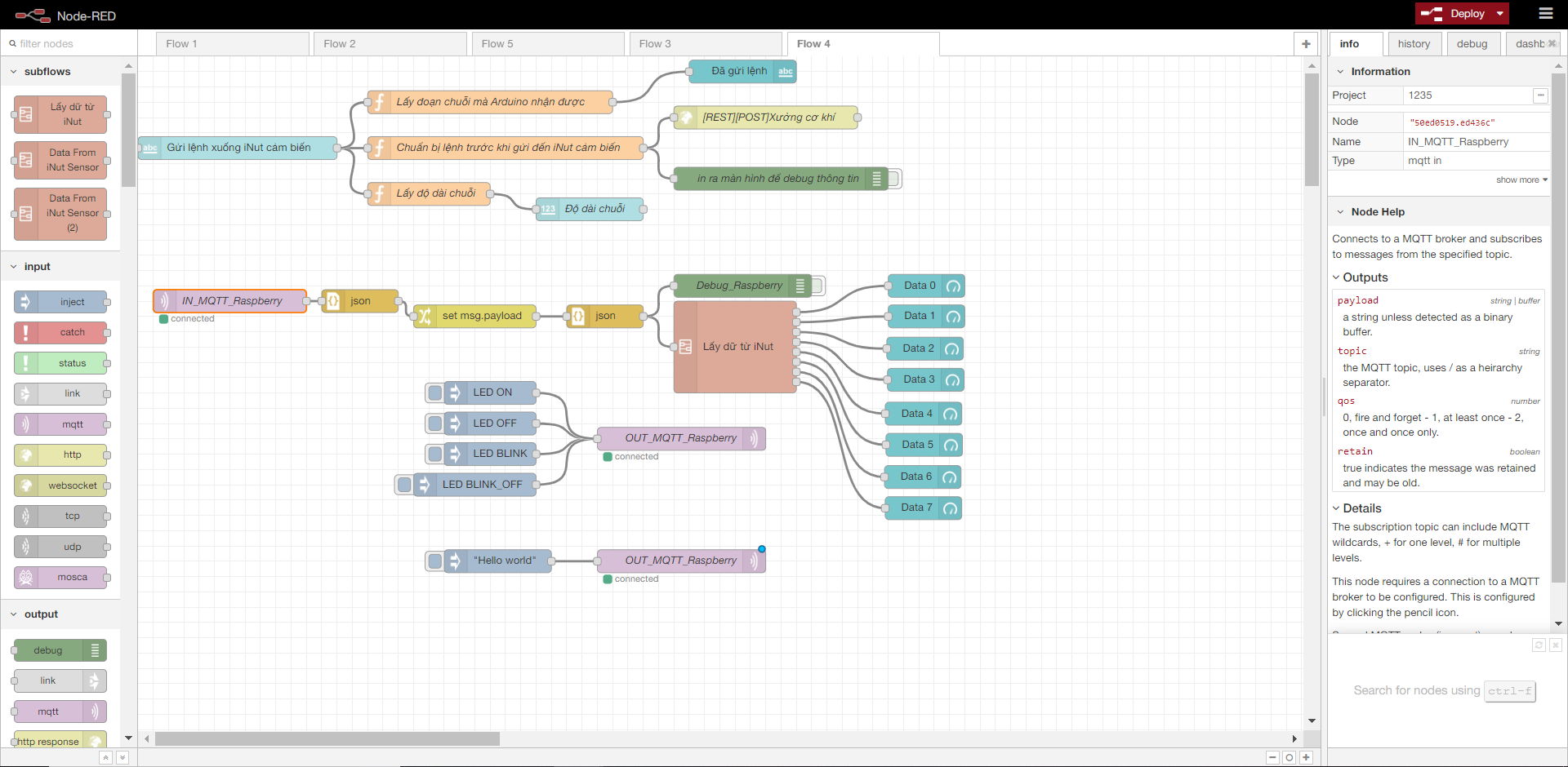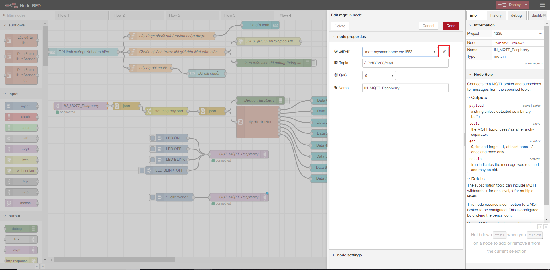 Sau đó các bạn thay đổi địa chỉ MQTT của ngõ vào [MQTT_IN]XXX (XXX là tên thiết bị iNut cảm biến của bạn; ở đây mình đã sửa thành khối lệnh có tên là IN_MQTT_Raspberry ) như sau: