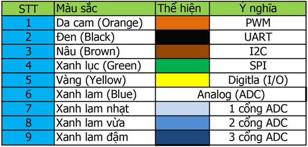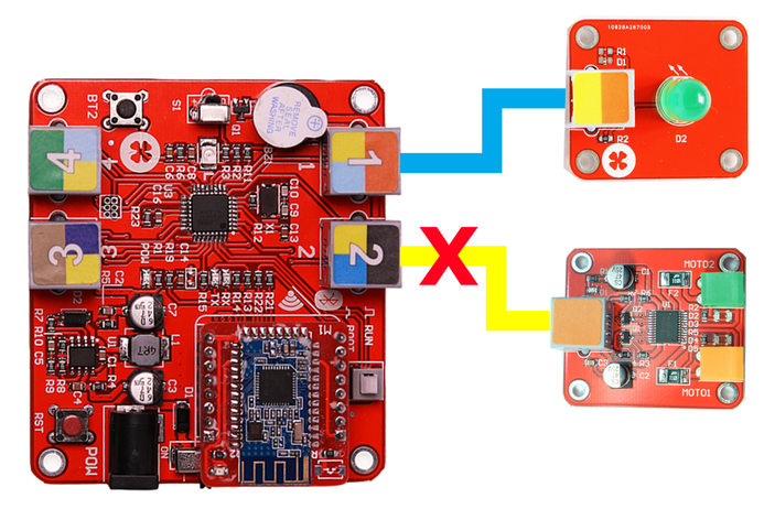 Đèn LED xanh được phép kết nối với bất kì Port nào, trong khi module điều khiển động cơ chỉ có thể kết nối với Port 1 chứa màu cam