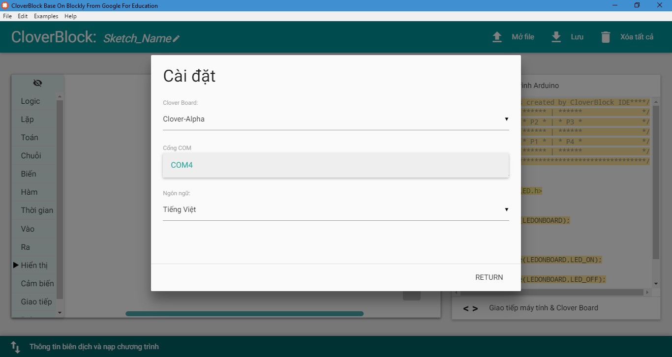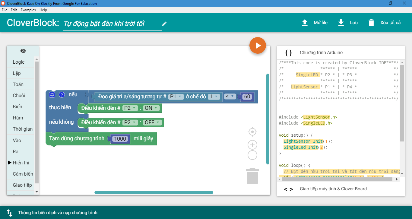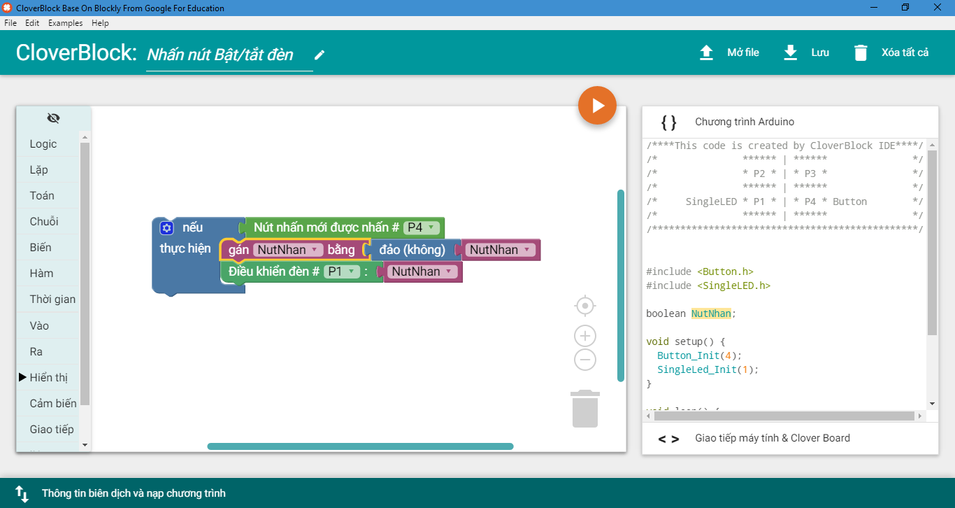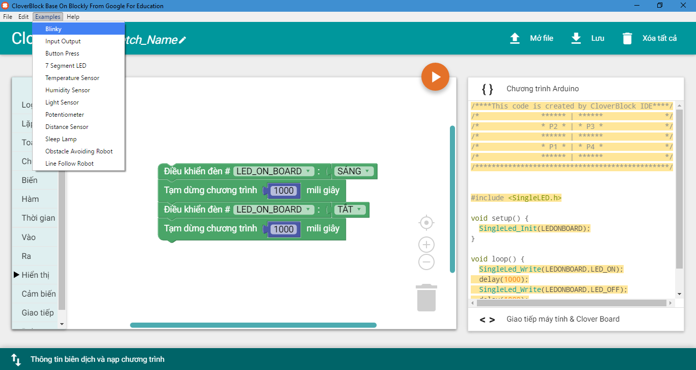 Xin chào các bạn, ở bài viết trước chúng ta đã được giới thiệu về CloverBlock - một phần mềm lập trình kéo thả chuyên dụng để thực hành STEM, bài viết đã giới thiệu cơ bản về xu hướng lập trình kéo thả trong phát triển tư duy khi dạy và học STEM, các tính năng chính của CloverBlock, có thể làm gì với phần mềm này. Ở bài viết này, chúng ta sẽ đi vào tìm hiểu chi tiết cách thức lập trình của CloverBlock với những thiết bị cụ thể như nút nhấn, đèn led, cảm biến cơ bản. Phần mềm giới thiệu trong bài viết là CloverBlock version 1.2 và các thiết bị trong bộ Clover EDU Starter.