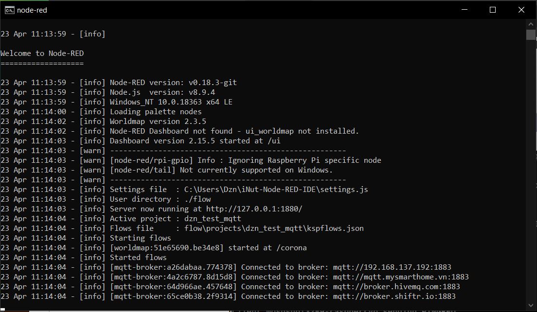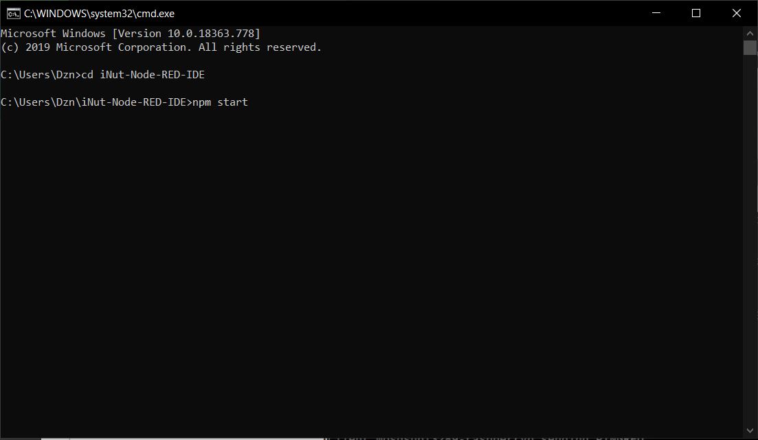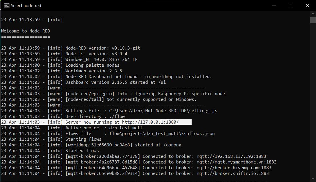 tiếp theo các bạn gõ lệnh để khởi động iNut-Node-RED-IDE