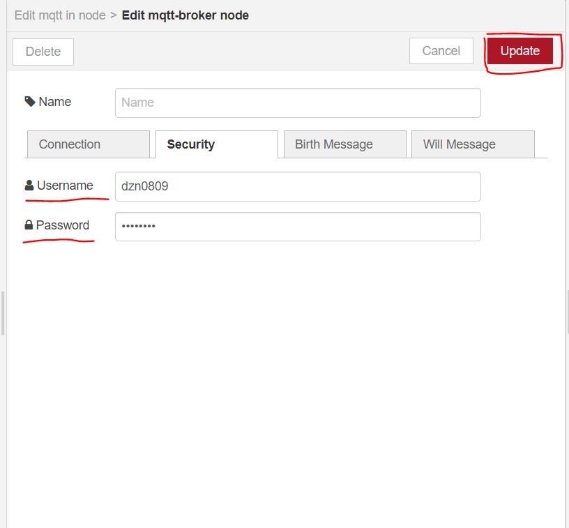 Ở bên iNut-Node-RED-IDE các bạn tiếp tục vào mục Security, nhập username và password lúc nãy các bạn tạo và chọn update.