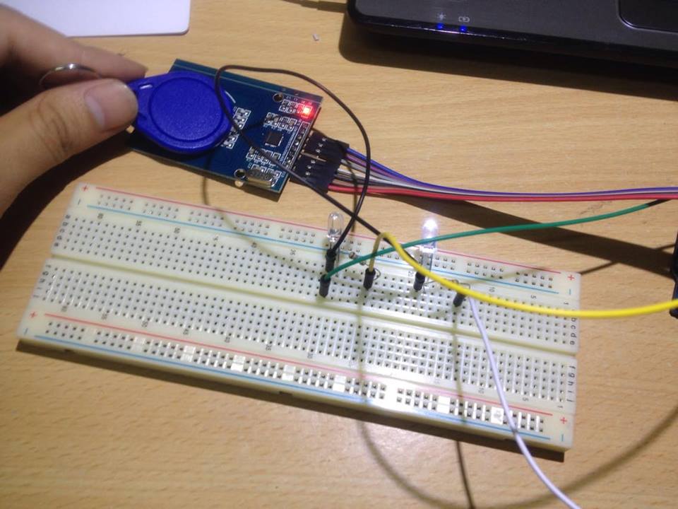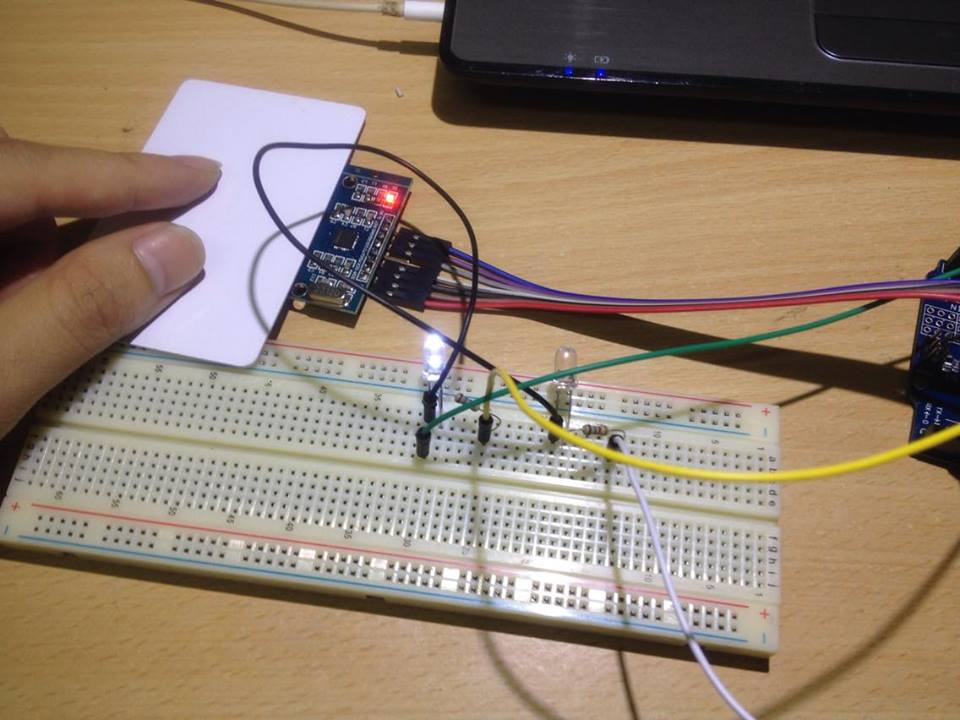Mình sử dụng thêm 2 đèn LED kết nối cực dương với chân 2 và 3. Cực âm kết nối GND trên bo mạnh Arduino để thể hiện đóng mở của thẻ từ ( Các bạn có thể test trên máy tính vẫn thể hiện được nhé )