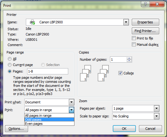 1. Chọn lệnh in Ctrl +P, bảng điều khiển máy in xuất hiện, chọn Odd pages để in các trang lẻ trước, số trang in bạn điền là 1-8