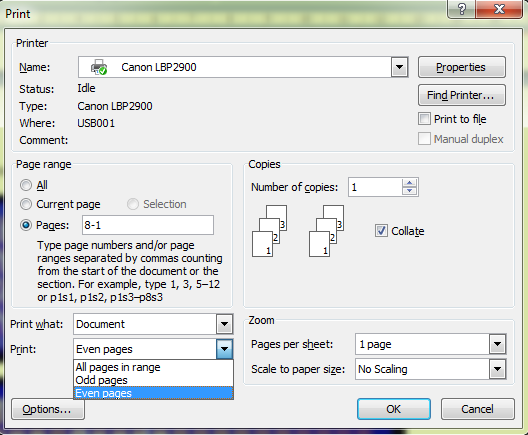3. Chọn lệnh in Ctrl +P, bảng điều khiển máy in xuất hiện, chọn Even pages để in các trang chẵn trước, số trang in bạn điền là 8-1, đây là điểm mấu chốt để bạn không phải đảo lại từng trang in