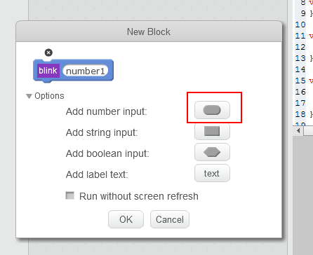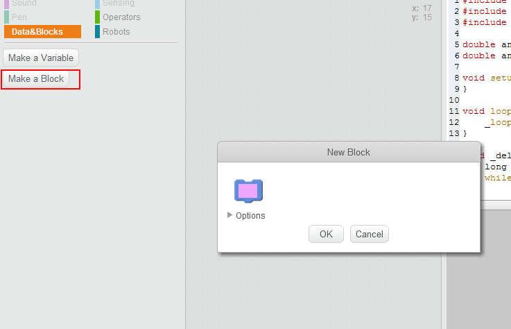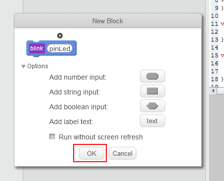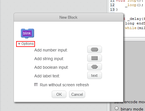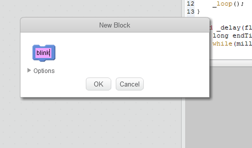 Nhấn Options để thêm thông số cho hàm, mình cần thêm thông số pin để báo pin cần blink, bạn cũng có thể thêm thông số thời gian blink.