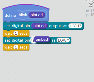 Mình lập trình cho nó blink chân pinLed (Khai báo ở hàm loop). Muốn lấy đối tượng pinLed thì bạn kéo nó ra ở phần define ý.
