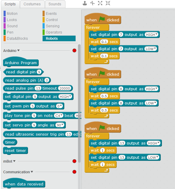 Mình sẽ tạo ra 3 sự kiện nhấn cờ, tương ứng với việc blink 3 led theo 3 chu kì 0.1 giây, 0.5 giây và 1 giây. Ngoài ra bạn còn có thể thay sự kiện khác cho nhấn cờ như nhấn phím. Sơ đồ lập trình