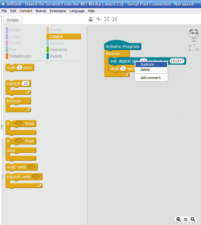 Nhân đôi 2 đối tượng (Để tạo lệnh tắt led) trong hàm loop bằng cách trái chuột vào đối tượng đầu trong nhóm forever và chọn duplicate sau đó cho vào ở dưới, nhớ sửa high thành low
