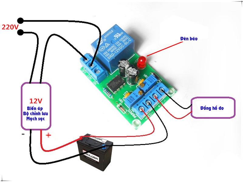 2. Điều chỉnh: VR2 để các pin điện áp lên đến 10.5V rơ le bắt đầu sạc.
