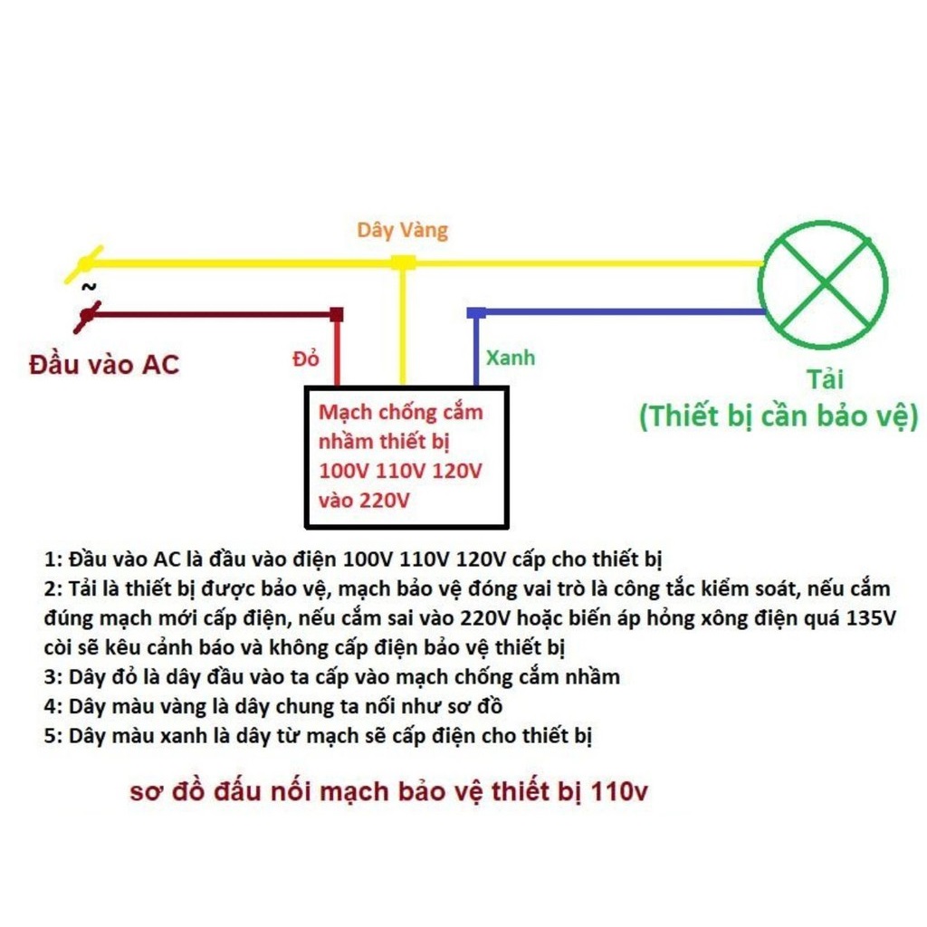 Nguyên lý hoạt động : Khi người dùng cắm đúng ổ điện 100V hoặc 110V bo mạch sẽ điều khiển đóng Role cấp điện cho thiết bị . Khi vô ý cắm nhầm sang 220V bo mạch không đóng Role để bảo vệ thiết bị. Sẽ có tiếng kêu tít tít cảnh báo là điện áp sử dụng không phù hợp (Bạn đang cắm nhầm điện áp cao).