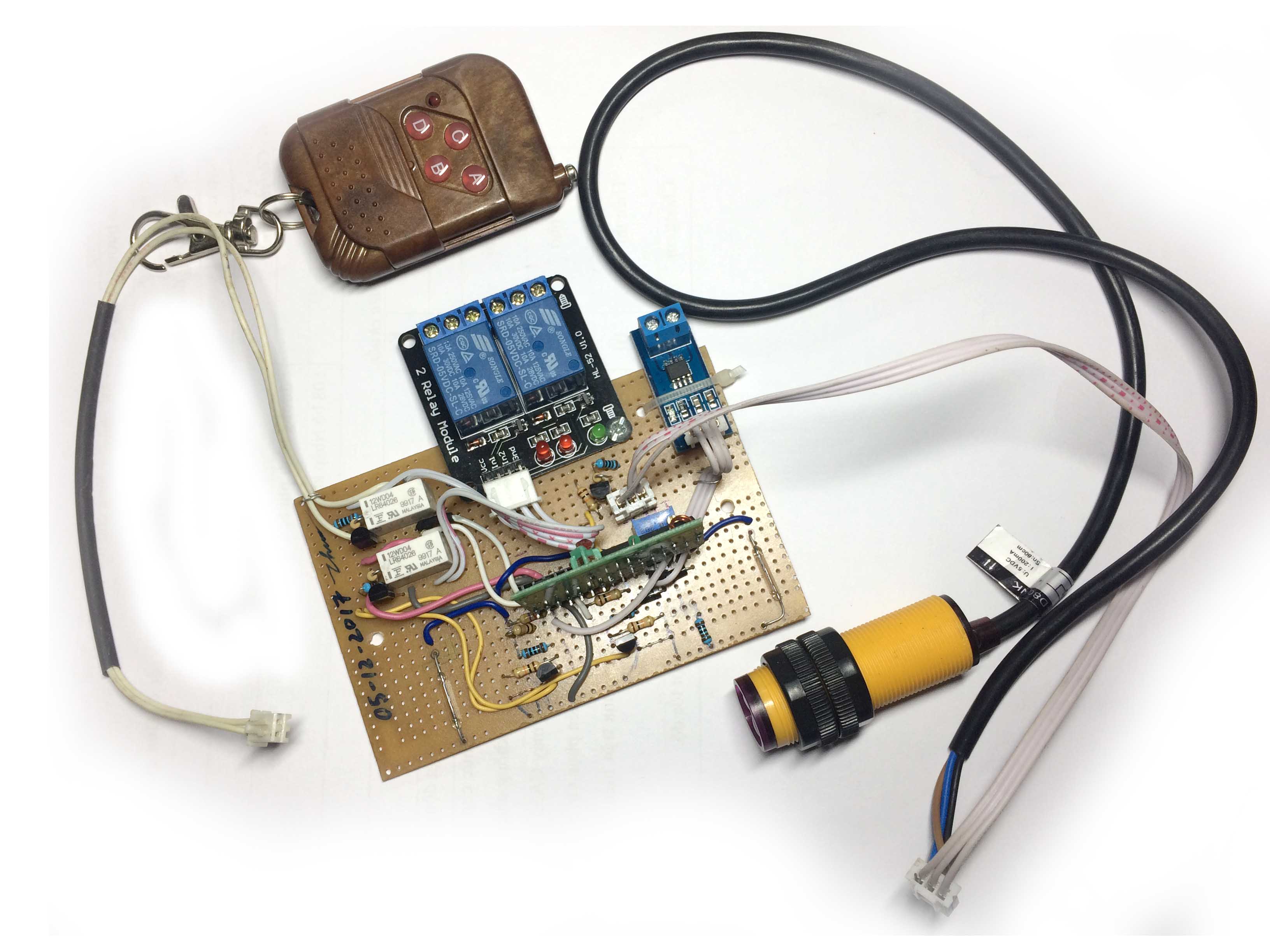 Ở giữ là vỉ điều khiển tư xa RF dùng sóng 315Mhz/433Mhz, ở mạch này tôi dùng phím A, B cho chức năng đóng hoặc mở, phím C cho chức năng dừng.