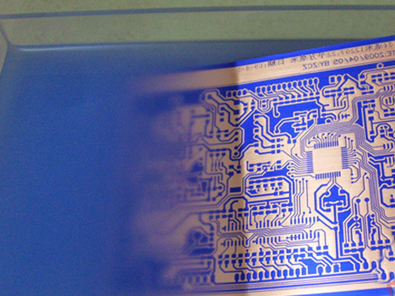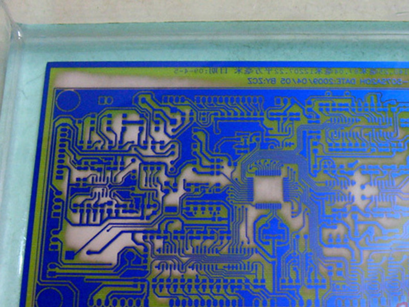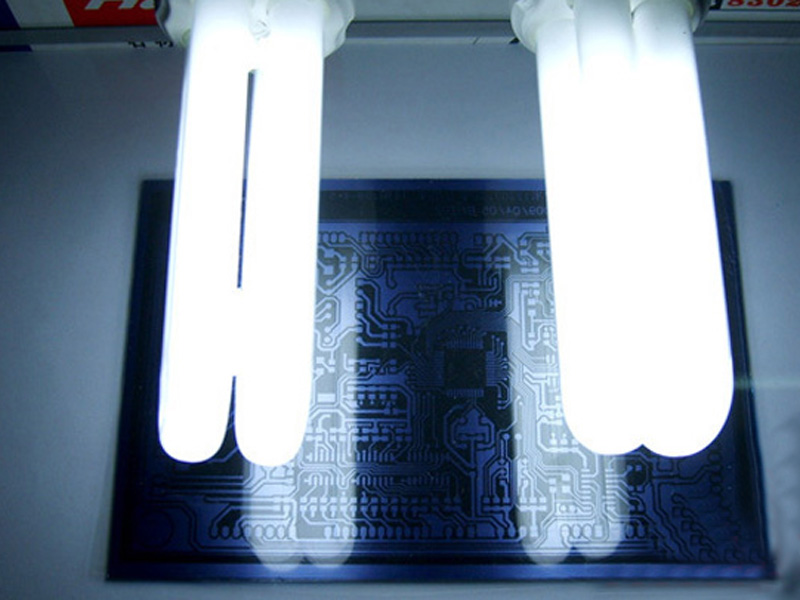 6. Đặt sơ đồ mạch in trên tấm cảm quang (Lưu ý: màng khô là âm, do đó nên in ngược lại) Sử dụng đèn típ tiết kiệm năng lượng loại 10W để phơi sáng. Máy bật trong 1 phút. Quá trình phơi sáng làm phim nhạy sáng sẽ đổi màu và màu sáng sẽ chuyển sang màu xanh đậm. Bạn sẽ dễ dàng thấy sơ đồ mạch của bạn xuất hiện trên bảng in.