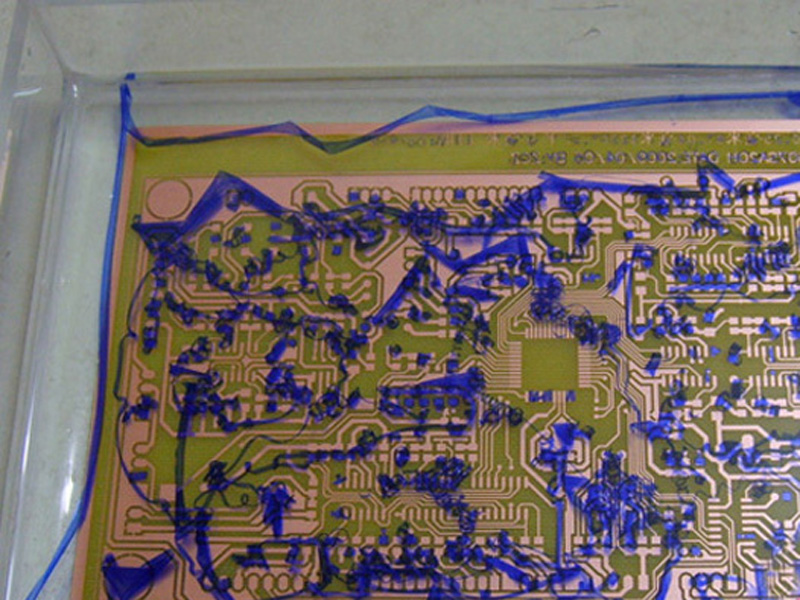 9. Sau khi tẩy bảng mạ đồng xong, ngâm bảng mạch vào dung dịch tẩy lớp phủ với tỷ lệ ở 1:60 hoặc 70, để bảng mạch ngâm trong vài phút.