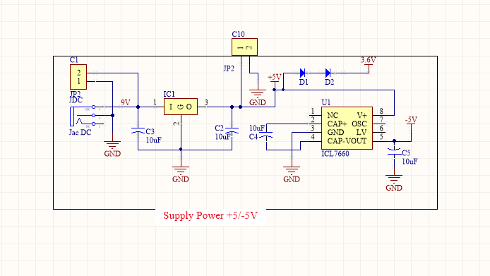 Mạch nguồn có chức năng cung cấp năng lượng cho mạch hoạt động với 2 mức điện áp +5V và -5V với nguồn đầu vào của mạch nguồn là nguồn điện +9V DC
