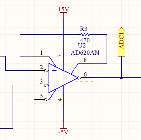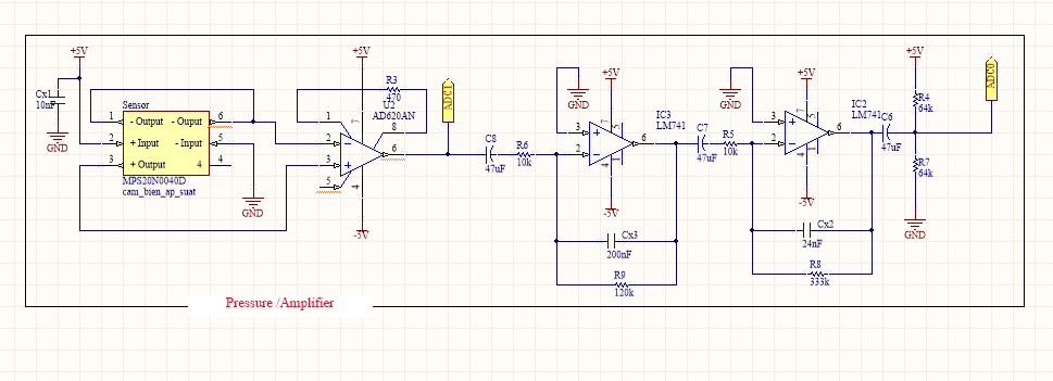 Vì điện áp đầu ra của bộ chuyển đổi áp suất rất nhỏ nên ta phải khuyếch đại tín hiệu để xử lý. Chúng ta sẽ sử dụng bộ khuếch đại IC AD620. Điện trở được sử dụng để xác định độ lợi của bộ khuếch đại theo phương trình