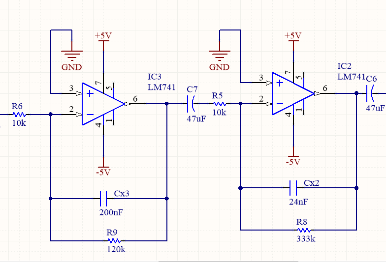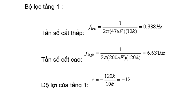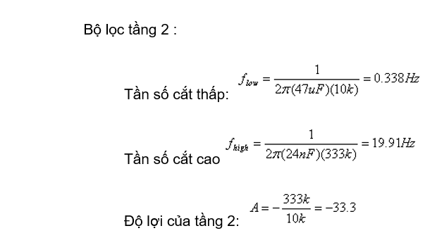 Bộ lọc băng tần được thiết kế gồm hai tầng. Lý do cho việc sử dụng hai tầng là tổng thể bộ lọc sẽ cung cấp một tăng lớn và đáp ứng tần số của bộ lọc sẽ được thực hiện tốt hơn việc chỉ sử dụng một tầng duy nhất. Phương pháp này sẽ cải thiện tỷ số tín hiệu nhiễu ở đầu ra. Sơ đồ cho cả hai bộ lọc được thể hiện trong hình trên.