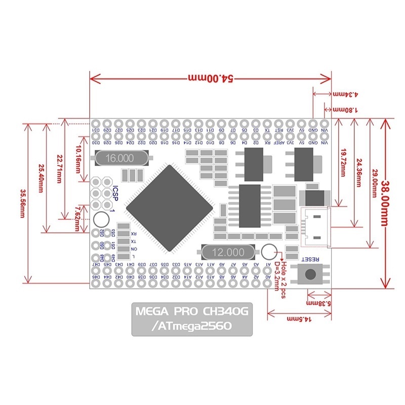 Bo mạch cho chức năng tương tự như Arduino Mega 2560. Đây là bo mạch nhúng, nhưng có cùng độ ổn định và sử dụng chip gốc ATmega2560 (16 MHz).