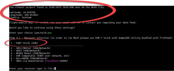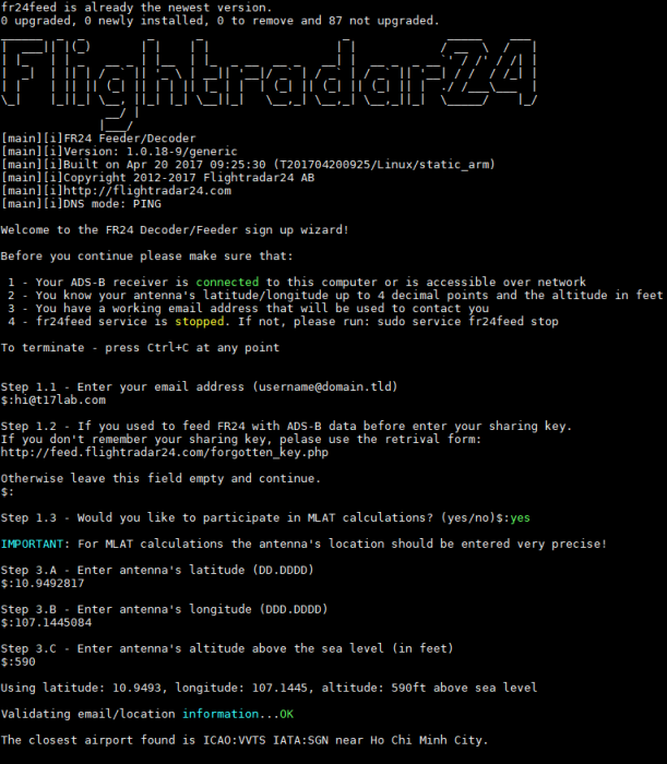 Sau khi kết nối Internet thành công, tôi tiến hành cài đặt một đoạn chương trình tự động được hỗ trợ từ Flightradar24, đoạn này sẽ hỗ trợ thiết lập driver SDR, NTP, phần mềm dump-1090 để giải mã và chuyển tọa độ thực của máy bay sang bản đồ trực quan. Thực thi lệnh sau tại giao diện dòng lệnh sudo bash -c “$(wget -O – http://repo.feed.flightradar24.com/install_fr24_rpi.sh)” và chờ quá trình cài đặt hoàn tất. Chương trình sẽ yêu cầu người dùng thiết lập một số thông tin cơ bản về tọa độ địa lý như vĩ độ/kinh độ/độ cao; bạn có thể truy cập trang web http://veloroutes.org/elevation/ và nhập địa chỉ hiện tại để xác định các thông tin trên.