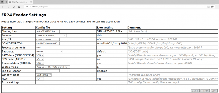 Để tiến hành cấu hình các thông số giải mã tín hiệu ADS-B máy bay, tôi kích hoạt dịch vụ đã cài đặt sudo service fr24feed start, và truy cập đến IP qua giao diện web theo cấu trúc http://CHIP_IP:8754/, bạn có thể tham khảo mục cấu hình như hình sau, nhấn Save và Restart để cấu hình có hiệu lực: