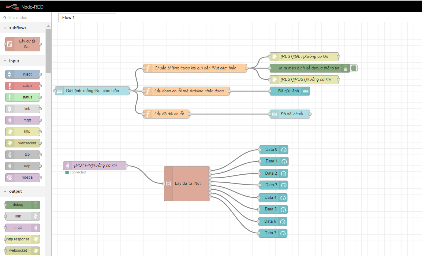 Điểm nổi bật tiếp theo mình muốn kể đến đó chính là INUT-NODE-RED-IDE. So sánh với App Invetor và Thinkable thì INUT-NODE-RED-IDE có phần tương tự ở giao diện lập trình kéo thả khá đon giản thích hợp với người mới tìm hiểu, tuy nhiên INUT-NODE-RED-IDE lại có lợi thế hơn về mặt tốc độ phản hồi và tính ổn định hơn đảm bảo bạn sẽ có những trải nghiệm tốt nhất trong quá trình lập trình.