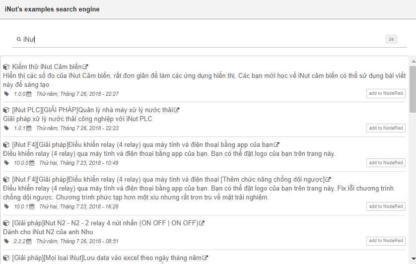 Nếu bạn chưa biết cách sử dụng thì cũng đừng lo lắng, INUT-NODE-RED-IDE có sẵn rất nhiều mẫu ví dụ từ mức độ dễ đến nâng cao bạn có thể tham khảo và sau đó tuỳ biến lại cho các project của mình nha.
