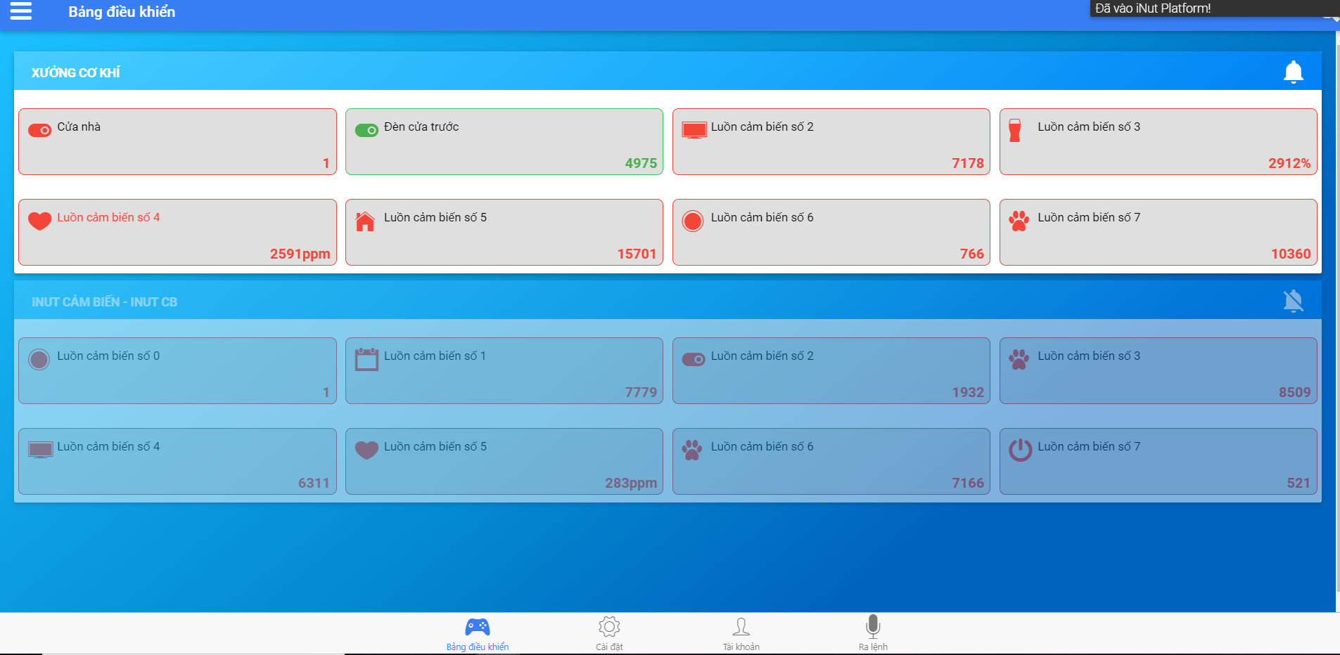 Cuối cùng có lẽ không thể không nhắc đến giao diên điều khiển trên smartphone. Giao diện rất trực quan và sinh động có thể nói là “yêu từ cái nhìn đầu tiên” luôn ấy, bạn có thể quản lý rất nhiều dự án với số lượng thiết bị khổng lồ, bạn có thể cách xa nửa vòng trái đất nhưng vẫn điều khiển được thiết bị trong nhà...chỉ với một chiếc smartphone có cài đặt phần mềm iNut. Đặc biệt app có hỗ trợ cả tiếng việt và tiếng anh, rất thích hợp cho quá trình nghiên cứu cũng như phát triển các sản phẩm của các bạn.