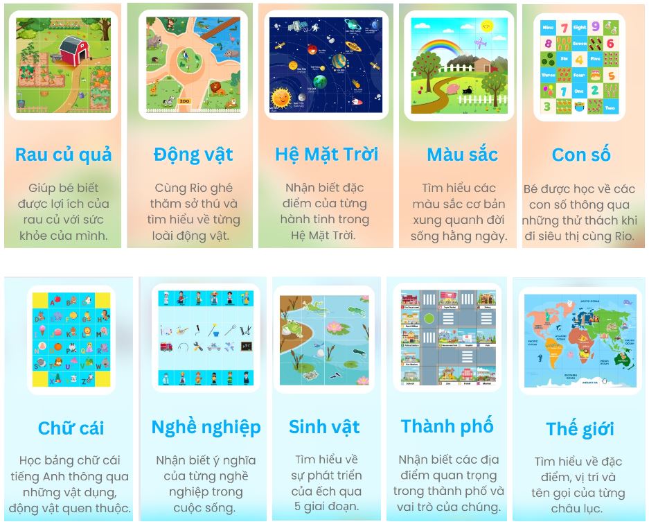 Có đến 20+ bản đồ, với các chủ đề kiến thức khoa học bổ ích cho bé vừa vui chơi vừa khám phá! Mỗi bản đồ sẽ là một câu chuyện về hành trình khám phá riêng của Rio, biến việc tìm hiểu thế giới xung quanh và kiến thức đầu đời của bé trở nên thú vị, không gây nhàm chán.