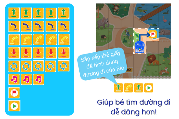 Với bộ 30 thẻ hỗ trợ lập trình đầy màu sắc, bé có thể dễ dàng sắp xếp để tìm đáp án, lập trình đường đi cho robot Rio vượt qua các thử thách trên bản đồ: