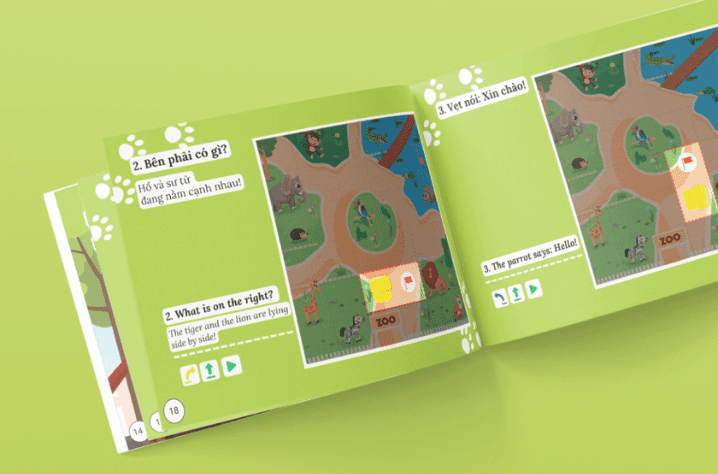 Các bài học được thiết kế dưới dạng trò chơi, câu đố và có hỗ trợ song ngữ Anh – Việt, giúp bé tiếp xúc với ngôn ngữ mới dễ dàng hơn và khuyến khích phát triển tư duy logic, khả năng sáng tạo.