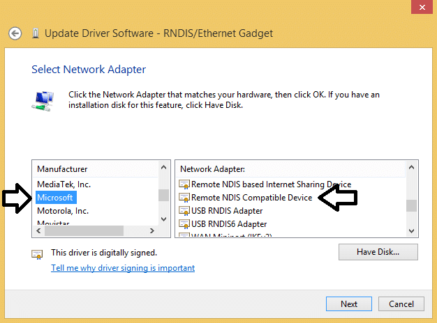 Chọn "Microsoft" ở menu bên trái, và "Remote NDIS Compatible Device" ở menu bên phải. Sau đó bấm "Next":