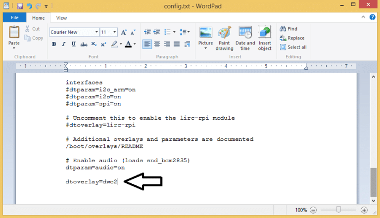 Sau khi flash image xong các bạn vào thư mục của microsd, tìm đến tập tin config.txt và mở nó bằng WordPad. Sau đó thêm dòng dtoverlay=dwc2 vào cuối file. Save và đóng WordPad lại.